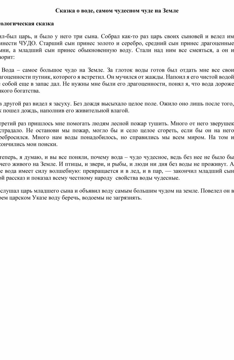 Послушал царь младшего сына и объявил воду самым большим чудом на земле. Повелел он в своем царском Указе воду беречь, водоемы не загрязнять.