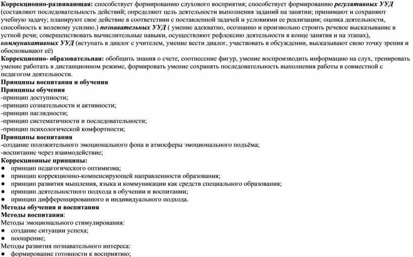Коррекционно-развивающая: способствует формированию слухового восприятия; способствует формированию регулятивных УУД (составляют последовательность действий; определяют цель деятельности выполнения заданий на занятии; принимают и сохраняют учебную задачу; планируют свое действие в соответствии с поставленной задачей и условиями ее реализации; оценка деятельности, способность к волевому усилию.) познавательных УУД ( умение адекватно, осознанно и произвольно строить речевое высказывание в устной речи; совершенствовать вычислительные навыки, осуществляют рефлексию деятельности в конце занятия и на этапах), коммуникативных УУД (вступать в диалог с учителем, умение вести диалог, участвовать в обсуждении, высказывают свою точку зрения и обосновывают её)