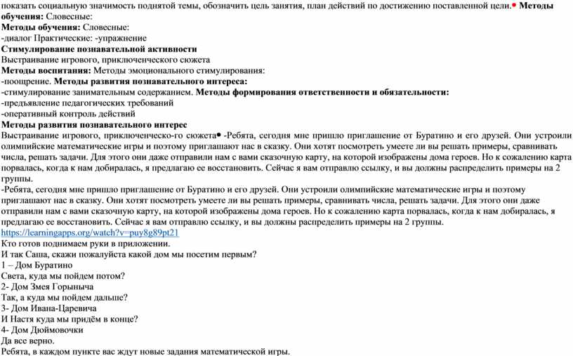 -Ребята, сегодня мне пришло приглашение от Буратино и его друзей. Они устроили олимпийские математические игры и поэтому приглашают нас в сказку. Они хотят посмотреть умеете ли вы решать примеры, сравнивать числа, решать задачи. Для этого они даже отправили нам с вами сказочную карту, на которой изображены дома героев. Но к сожалению карта порвалась, когда к нам добиралась, я предлагаю ее восстановить. Сейчас я вам отправлю ссылку, и вы должны распределить примеры на 2 группы. https://learningapps.org/watch?v=puy8g89pt21 Кто готов поднимаем руки в приложении. И так Саша, скажи пожалуйста какой дом мы посетим первым? 1 – Дом Буратино Света, куда мы пойдем потом? 2- Дом Змея Горыныча Так, а куда мы пойдем дальше? 3- Дом Ивана-Царевича И Настя куда мы придём в конце? 4- Дом Дюймовочки Да все верно. Ребята, в каждом пункте вас ждут новые задания математической игры. Но для того чтобы отправиться в сказку, герои сказок хотят проверить как хорошо вы знаете сказки. Я буду задавать вам вопросы по сказкам, а вы должны написать в чате правильный ответ. Маша повтори пожалуйста, что вы будете делать. ДА, спасибо И так начнем.