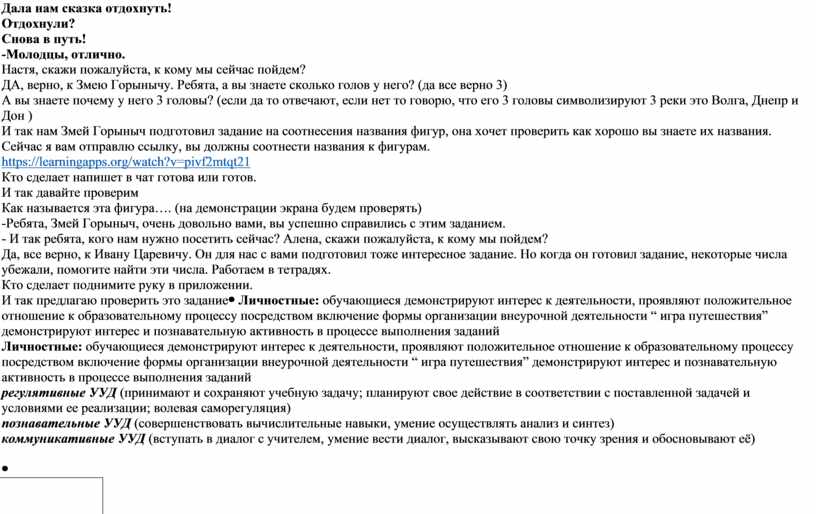 - Мы попали с вами в сказку Скажите какой дом мы должны с вами посетить первым? Отвечаем по поднятой руке. Маша скажи пожалуйста. ДА верно, дом Буратино -И так Буратино подготовил для нас очень интересное задание. Он предлагает нам решить цепочку примеров. Давайте два примера сделаем вместе. НА выполнения задания вам дается 5 минут. Работаем в тетрадях Кто сделает поставьте знак + Не забываем сто спинка прамая, близко в экран мы не смотрим. И так я вижу вы сделали, давайте проверим. И так у всех все получилось? поднимите руку у кого все получилось. Спасибо, у кого есть ошибки ничего страшного, вы можете остаться после занятия я вам все объясню. И так ребятами с вами справились с заданием Буратино, он нас очень сильно хвалит, молодцы. И так ребята, прежде чем отправится дальше, я предлагаю отдохнуть. Сказка даст нам отдохнуть. Дала нам сказка отдохнуть! -Молодцы, отлично. Настя, скажи пожалуйста, к кому мы сейчас пойдем? ДА, верно, к Змею Горынычу. Ребята, а вы знаете сколько голов у него? (да все верно 3) А вы знаете почему у него 3 головы? (если да то отвечают, если нет то говорю, что его 3 головы символизируют 3 реки это Волга, Днепр и Дон ) И так нам Змей Горыныч подготовил задание на соотнесения названия фигур, она хочет проверить как хорошо вы знаете их названия. Сейчас я вам отправлю ссылку, вы должны соотнести названия к фигурам. https://learningapps.org/watch?v=pivf2mtqt21 Кто сделает напишет в чат готова или готов. И так давайте проверим Как называется эта фигура…. (на демонстрации экрана будем проверять) -Ребята, Змей Горыныч, очень довольно вами, вы успешно справились с этим заданием. - И так ребята, кого нам нужно посетить сейчас? Алена, скажи пожалуйста, к кому мы пойдем? Да, все верно, к Ивану Царевичу. Он для нас с вами подготовил тоже интересное задание. Но когда он готовил задание, некоторые числа убежали, помогите найти эти числа. Работаем в тетрадях. Кто сделает поднимите руку в приложении. И так предлагаю проверить это задание |