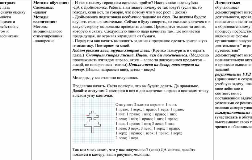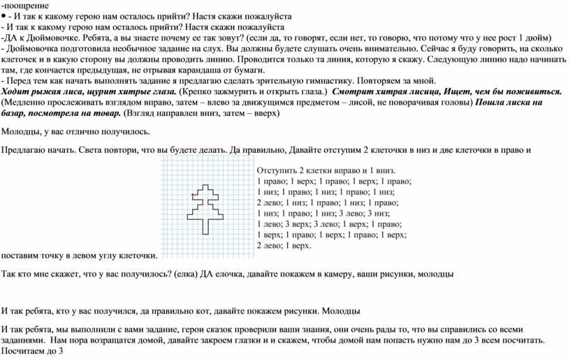 - И так к какому герою нам осталось прийти? Настя скажи пожалуйста -ДА к Дюймовочке. Ребята, а вы знаете почему ее так зовут? (если да, то говорят, если нет, то говорю, что потому что у нее рост 1 дюйм) - Дюймовочка подготовила необычное задание на слух. Вы должны будете слушать очень внимательно. Сейчас я буду говорить, на сколько клеточек и в какую сторону вы должны проводить линию. Проводится только та линия, которую я скажу. Следующую линию надо начинать там, где кончается предыдущая, не отрывая карандаша от бумаги. - Перед тем как начать выполнять задание я предлагаю сделать зрительную гимнастику. Повторяем за мной. Ходит рыжая лиса, щурит хитрые глаза. (Крепко зажмурить и открыть глаза.) Смотрит хитрая лисица, Ищет, чем бы поживиться. (Медленно прослеживать взглядом вправо, затем – влево за движущимся предметом – лисой, не поворачивая головы) Пошла лиска на базар, посмотрела на товар. (Взгляд направлен вниз, затем – вверх) Молодцы, у вас отлично получилось. Предлагаю