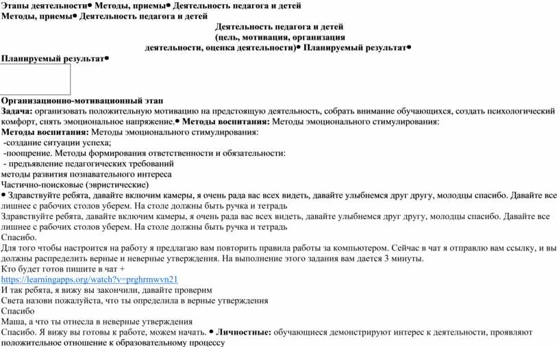 Деятельность педагога и детей (цель, мотивация, организация деятельности, оценка деятельности) |