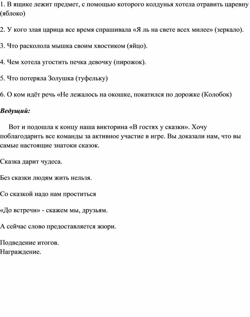 Вот и подошла к концу наша викторина «В гостях у сказки». Хочу поблагодарить все команды за активное участие в игре. Вы доказали нам, что вы самые настоящие знатоки сказок.