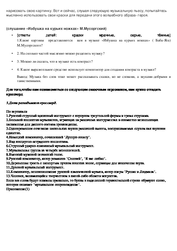 (слушание «Избушка на курьих ножках» М.Мусоргский)