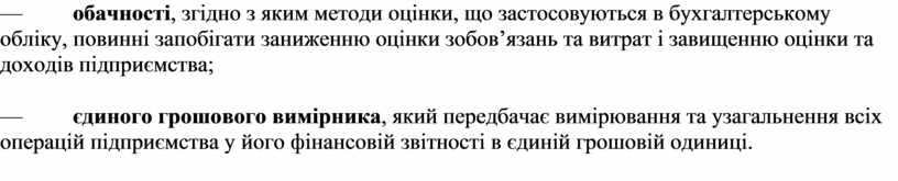 — обачності, згідно з яким методи оцінки, що застосовуються в бухгалтерському обліку, повинні запобігати заниженню оцінки зобов’язань та витрат і завищенню оцінки та доходів підприємства;