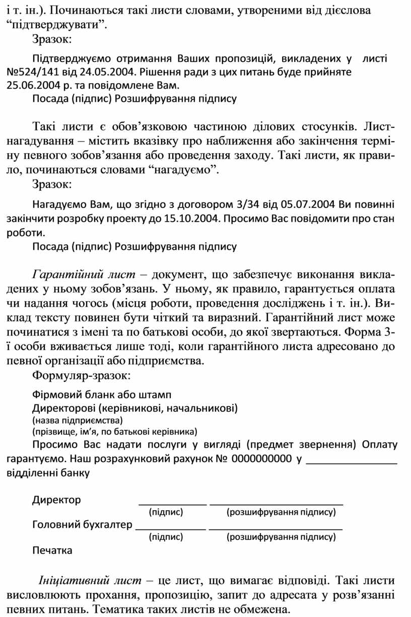 13. Підписує службовий лист переважно керівник установи (ор- ганізації, підприємства), його заступник чи керівник структурного підрозділу. Якщо лист написано на бланку установи, то зазначають лише посаду, ініціали та прізвище особи, яка підписує лист (назву установи не повторюють).