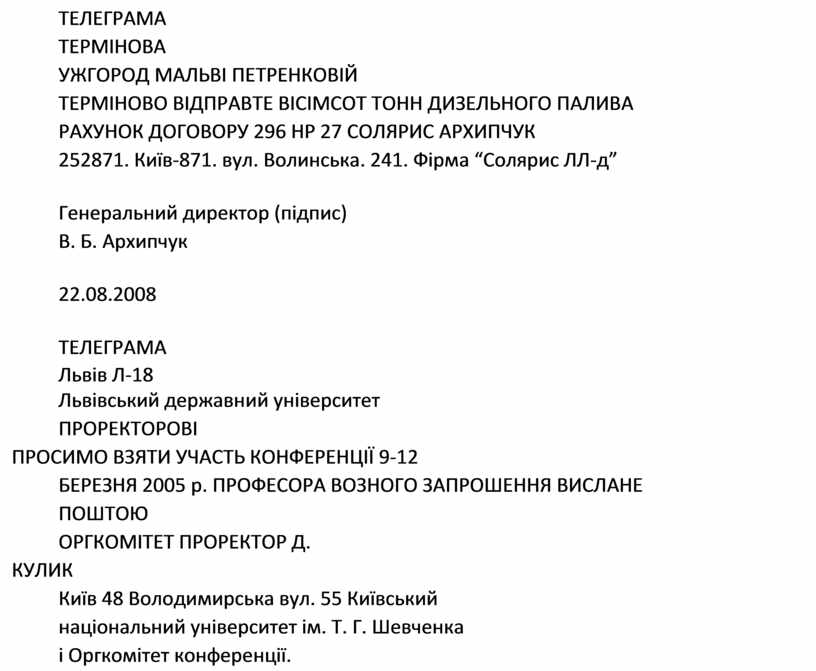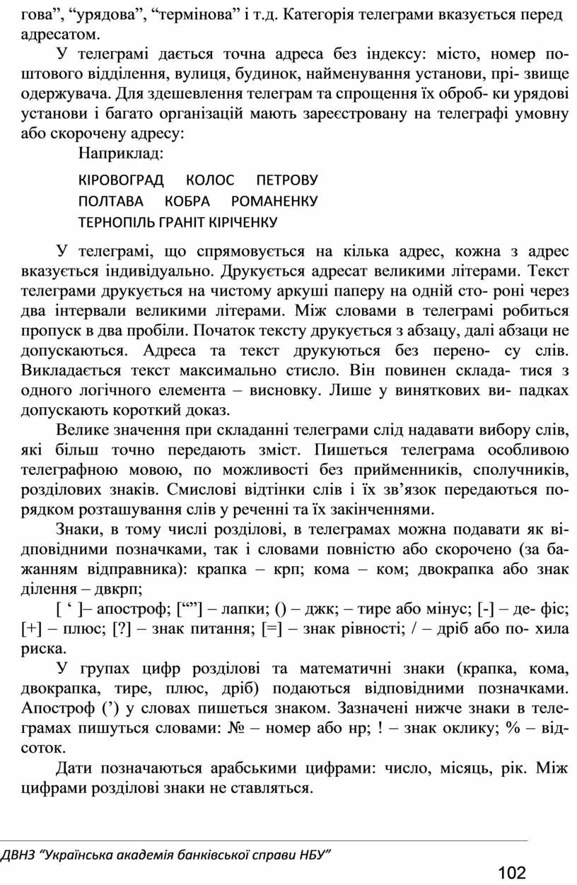 У телеграмі, що спрямовується на кілька адрес, кожна з адрес вказується індивідуально. Друкується адресат великими літерами. Текст телеграми друкується на чистому аркуші паперу на одній сто- роні через два інтервали великими літерами. Між словами в телеграмі робиться пропуск в два пробіли. Початок тексту друкується з абзацу, далі абзаци не допускаються. Адреса та текст друкуються без перено- су слів. Викладається текст максимально стисло. Він повинен склада- тися з одного логічного елемента – висновку. Лише у виняткових ви- падках допускають короткий доказ.