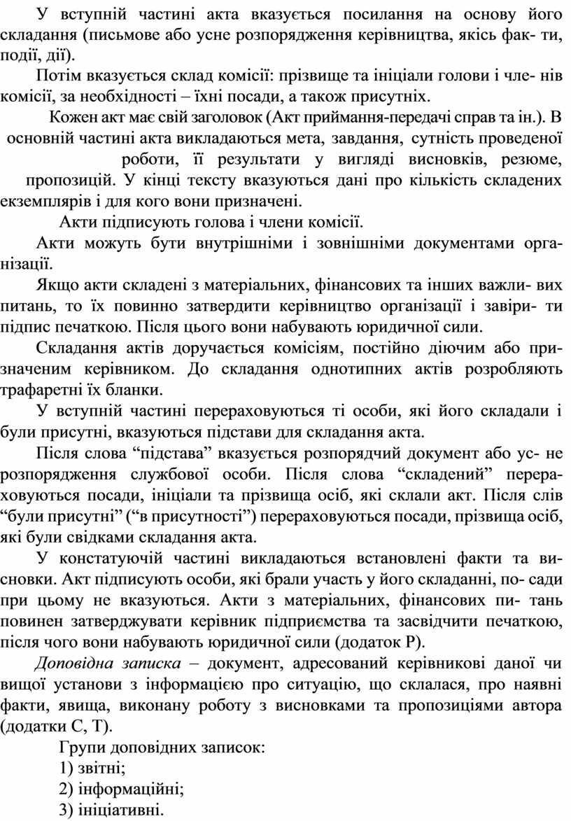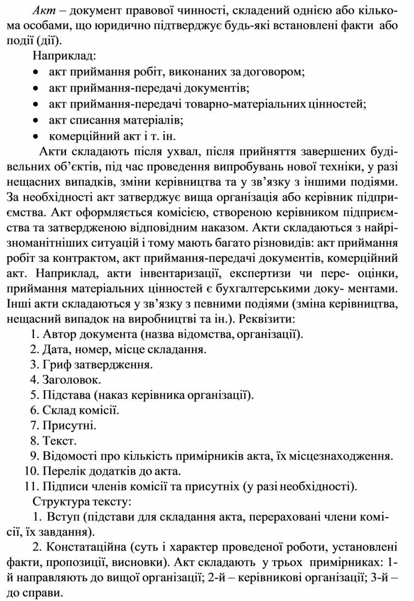 Акти складають після ухвал, після прийняття завершених буді- вельних об’єктів, під час проведення випробувань нової техніки, у разі нещасних випадків, зміни керівництва та у зв’язку з іншими подіями. За необхідності акт затверджує вища організація або керівник підпри- ємства. Акт оформляється комісією, створеною керівником підприєм- ства та затвердженою відповідним наказом. Акти складаються з найрі- зноманітніших ситуацій і тому мають багато різновидів: акт приймання робіт за контрактом, акт приймання-передачі документів, комерційний акт. Наприклад, акти інвентаризації, експертизи чи пере- оцінки, приймання матеріальних цінностей є бухгалтерськими доку- ментами. Інші акти складаються у зв’язку з певними подіями (зміна керівництва, нещасний випадок на виробництві та ін.). Реквізити: