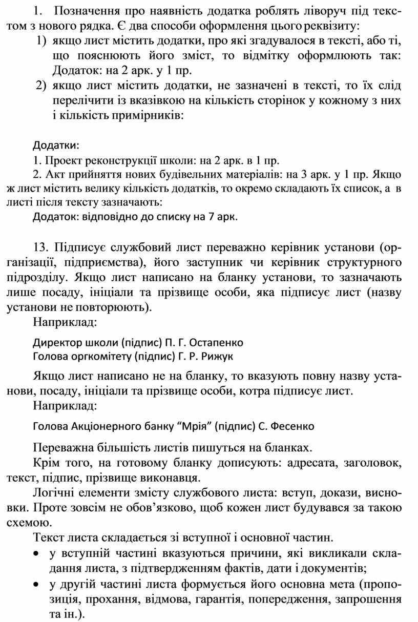 1) якщо лист містить додатки, про які згадувалося в тексті, або ті, що пояснюють його зміст, то відмітку оформлюють так: Додаток: на 2 арк. у 1 пр.