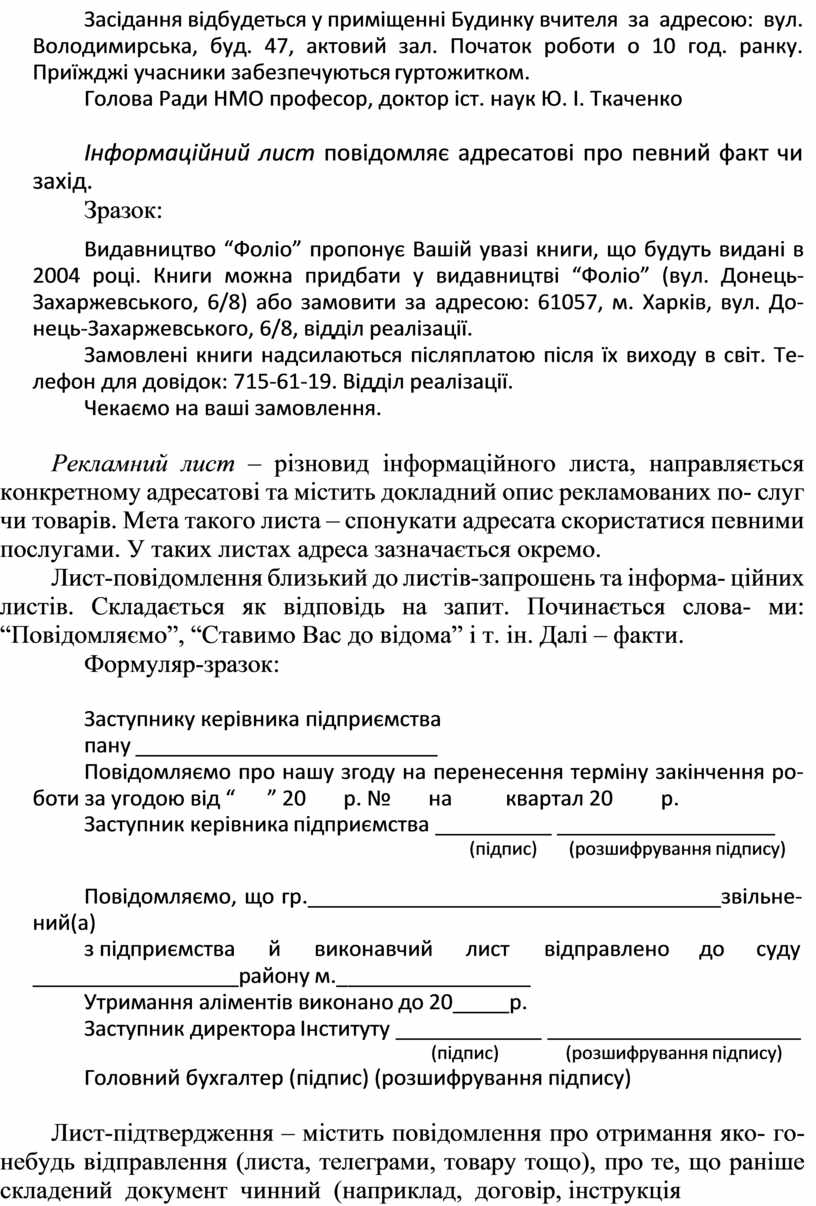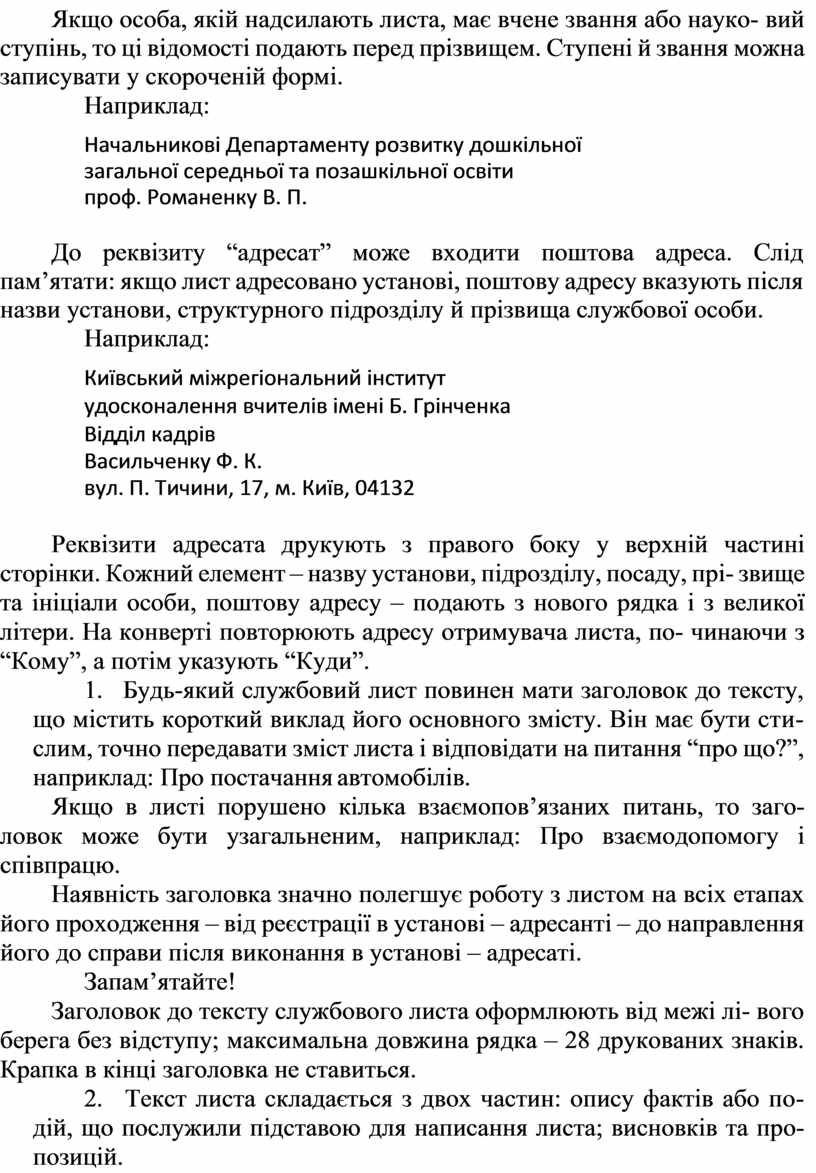 Крім того, на готовому бланку дописують: адресата, заголовок, текст, підпис, прізвище виконавця.