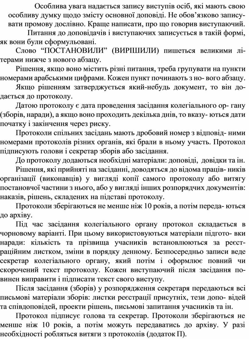 Протокол – документ, який фіксує послідовний хід обговорення питань та прийняття рішень на зборах, нарадах, конференціях та засі- даннях колегіальних органів. Протокол також є документом, який складений офіційною особою для засвідчення якогось факту (протокол інспектора пожежної охорони, санітарного інспектора тощо). За своїм змістом вони наближаються до актів; частка їх невелика (додаток Н).