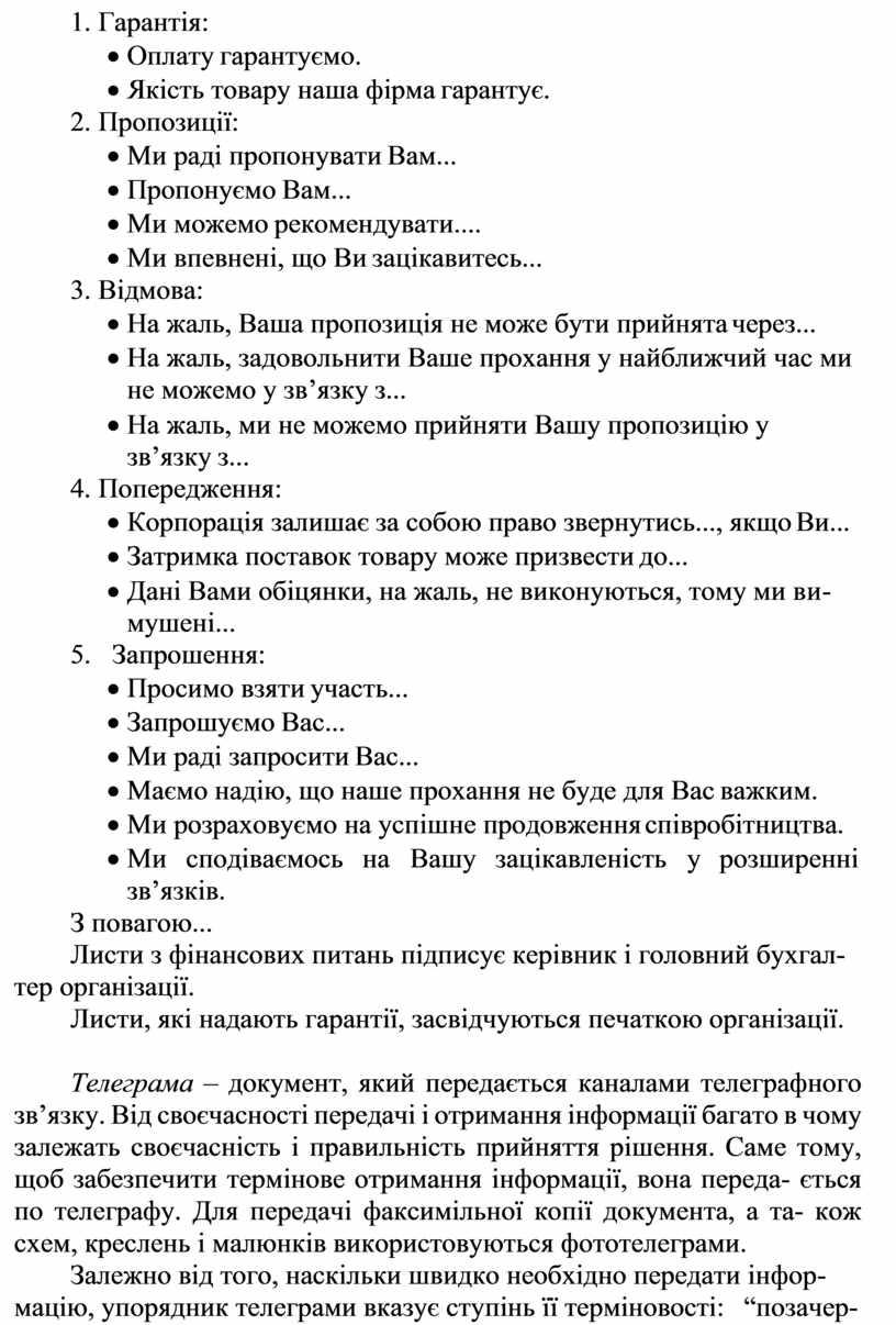 Телеграма – документ, який передається каналами телеграфного зв’язку. Від своєчасності передачі і отримання інформації багато в чому залежать своєчасність і правильність прийняття рішення. Саме тому, щоб забезпечити термінове отримання інформації, вона переда- ється по телеграфу. Для передачі факсимільної копії документа, а та- кож схем, креслень і малюнків використовуються фототелеграми.