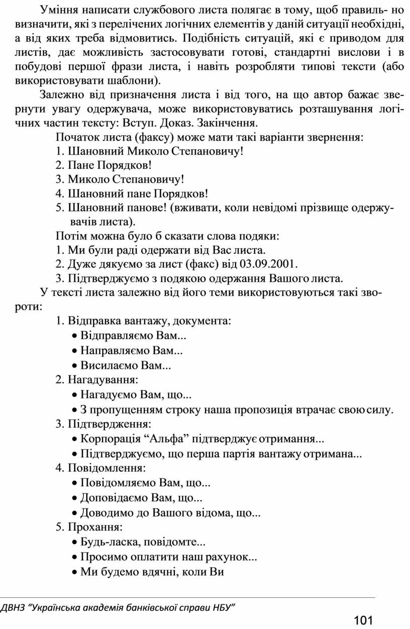 Уміння написати службового листа полягає в тому, щоб правиль- но визначити, які з перелічених логічних елементів у даній ситуації необхідні, а від яких треба відмовитись. Подібність ситуацій, які є приводом для листів, дає можливість застосовувати готові, стандартні вислови і в побудові першої фрази листа, і навіть розробляти типові тексти (або використовувати шаблони).