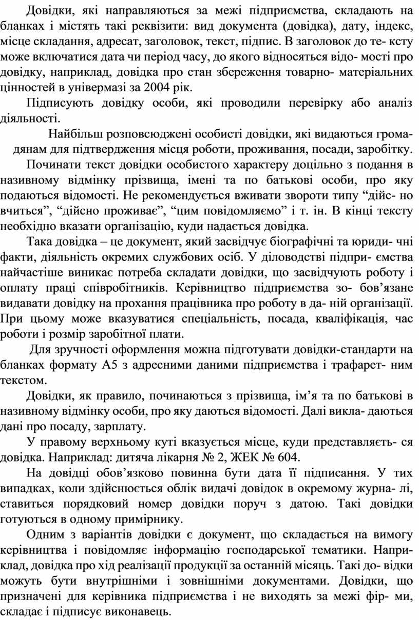 Довідки, які направляються за межі підприємства, складають на бланках і містять такі реквізити: вид документа (довідка), дату, індекс, місце складання, адресат, заголовок, текст, підпис. В заголовок до те- ксту може включатися дата чи період часу, до якого відносяться відо- мості про довідку, наприклад, довідка про стан збереження товарно- матеріальних цінностей в універмазі за 2004 рік.