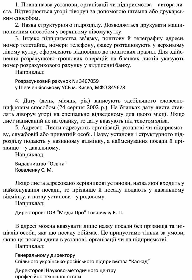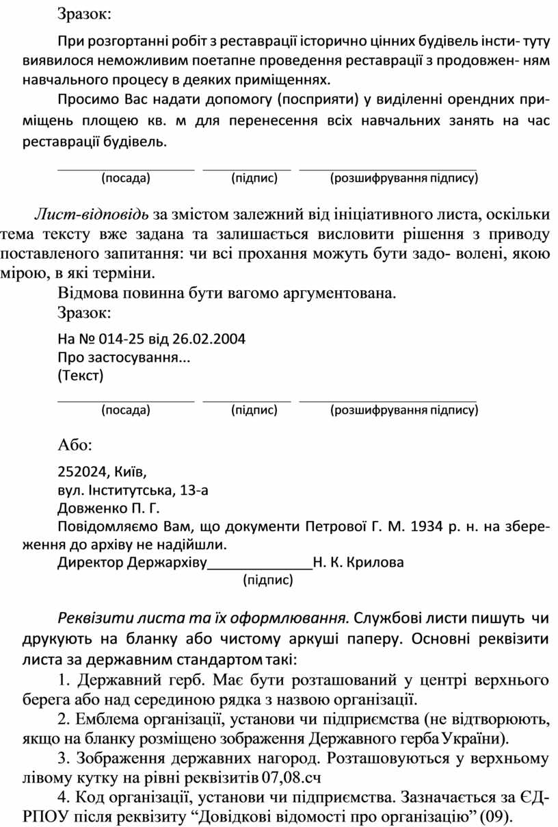 Якщо лист написано не на бланку, то вказують повну назву уста- нови, посаду, ініціали та прізвище особи, котра підписує лист.