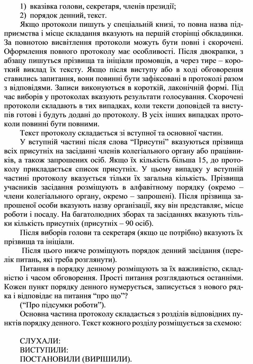 Основна частина протоколу складається з розділів відповідних пу- нктів порядку денного. Текст кожного розділу розміщується за схемою: