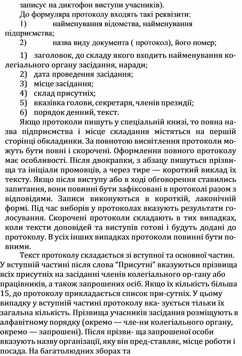 Якщо протоколи пишуть у спеціальній книзі, то повна на- зва підприємства і місце складання містяться на першій сторінці обкладинки. За повнотою висвітлення протоколи мо- жуть бути повні і скорочені. Оформлення повного протоколу має особливості. Після двокрапки, з абзацу пишуться прізви- ща та ініцiали промовцiв, а через тире — короткий виклад їх тексту. Якщо після виступу або в ході обговорення ставились запитання, вони повинні бути зафіксовані в протоколі разом з відповідями. Записи виконуються в короткій, лаконічній формі. Під час виборів у протоколах вказують результати го- лосування. Скорочені протоколи складають в тих випадках, коли тексти доповідей та виступів готові і будуть додані до протоколу. В усіх інших випадках протоколи повинні бути по- вними.