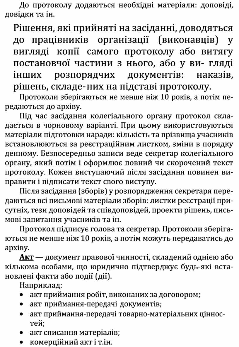 Протокол — документ, який фіксує послідовний хід обго- ворення питань та прийняття рішень на зборах, нарадах, кон- ференціях та засіданнях колегіальних органів (рис. 4). Прото- кол також є документом, який складений офіційною особою для засвідчення якогось факту (протокол інспектора пожеж- ної охорони, санітарного інспектора тощо). За своїм змістом вони наближаються до актів; частка їх невелика.