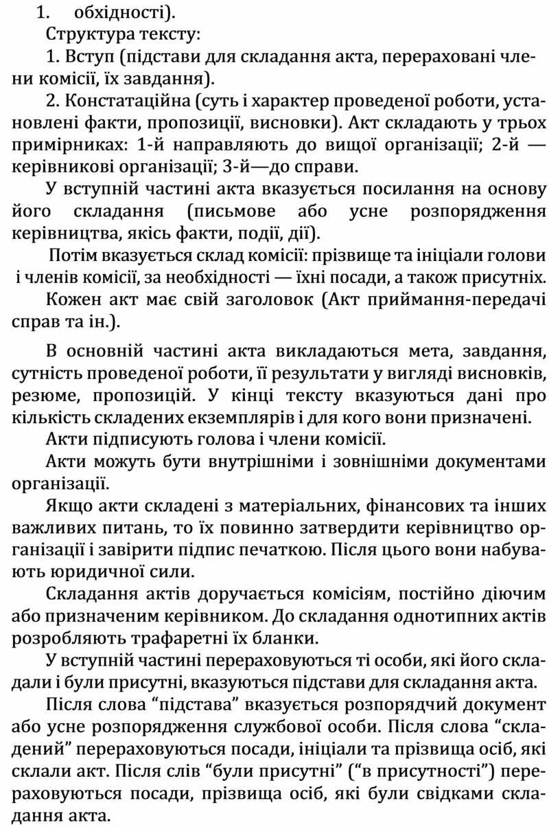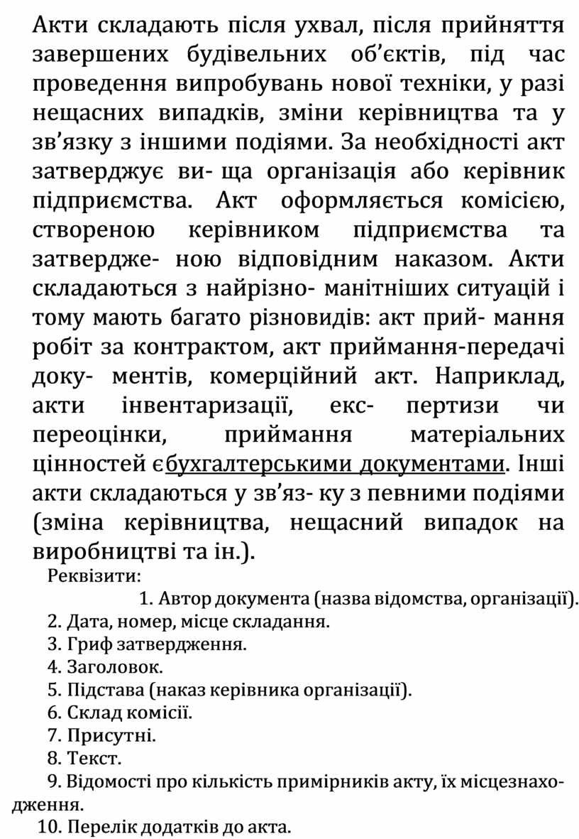 Акти складають після ухвал, після прийняття завершених будівельних об’єктів, під час проведення випробувань нової техніки, у разі нещасних випадків, зміни керівництва та у зв’язку з іншими подіями. За необхідності акт затверджує ви- ща організація або керівник підприємства. Акт оформляється комісією, створеною керівником підприємства та затвердже- ною відповідним наказом. Акти складаються з найрізно- манітніших ситуацій і тому мають багато різновидів: акт прий- мання робіт за контрактом, акт приймання-передачі доку- ментів, комерційний акт. Наприклад, акти інвентаризації, екс- пертизи чи переоцінки, приймання матеріальних цінностей є бухгалтерськими документами. Інші акти складаються у зв’яз- ку з певними подіями (зміна керівництва, нещасний випадок на виробництві та ін.).