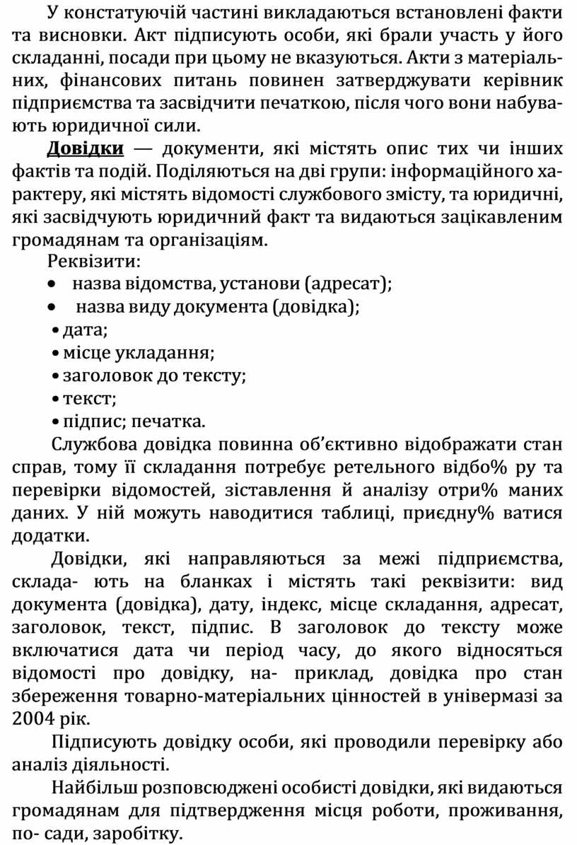 Довідки, які направляються за межі підприємства, склада- ють на бланках і містять такі реквізити: вид документа (довідка), дату, індекс, місце складання, адресат, заголовок, текст, підпис. В заголовок до тексту може включатися дата чи період часу, до якого відносяться відомості про довідку, на- приклад, довідка про стан збереження товарно-матеріальних цінностей в універмазі за 2004 рік.