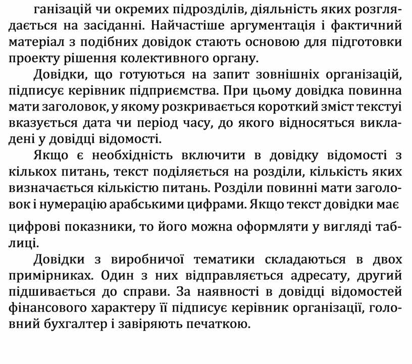 Довідки, що готуються на запит зовнішніх організацій, підписує керівник підприємства. При цьому довідка повинна мати заголовок, у якому розкривається короткий зміст тексту і вказується дата чи період часу, до якого відносяться викла- дені у довідці відомості.