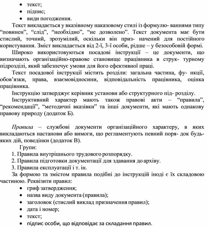 Текст викладається у вказівному наказовому стилі із формулю- ваннями типу “повинен”, “слід”, “необхідно”, “не дозволено”. Текст документа має бути стислий, точний, зрозумілий, оскільки він приз- начений для постійного користування. Зміст викладається від 2-ї, 3-ї особи, рідше – у безособовій формі.
