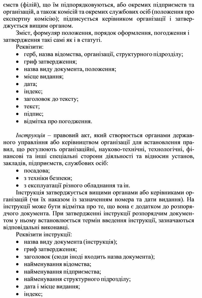 Інструкція – правовий акт, який створюється органами держав- ного управління або керівництвом організації для встановлення пра- вил, що регулюють організаційні, науково-технічні, технологічні, фі- нансові та інші спеціальні сторони діяльності та відносин установ, закладів, підприємств, службових осіб: