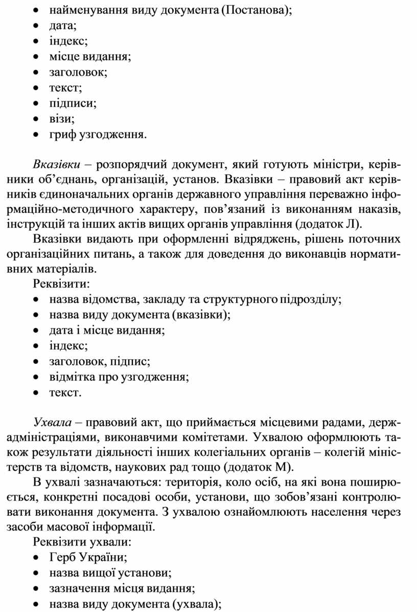 Ухвала – правовий акт, що приймається місцевими радами, держ- адміністраціями, виконавчими комітетами. Ухвалою оформлюють та- кож результати діяльності інших колегіальних органів – колегій мініс- терств та відомств, наукових рад тощо (додаток М).