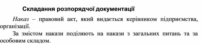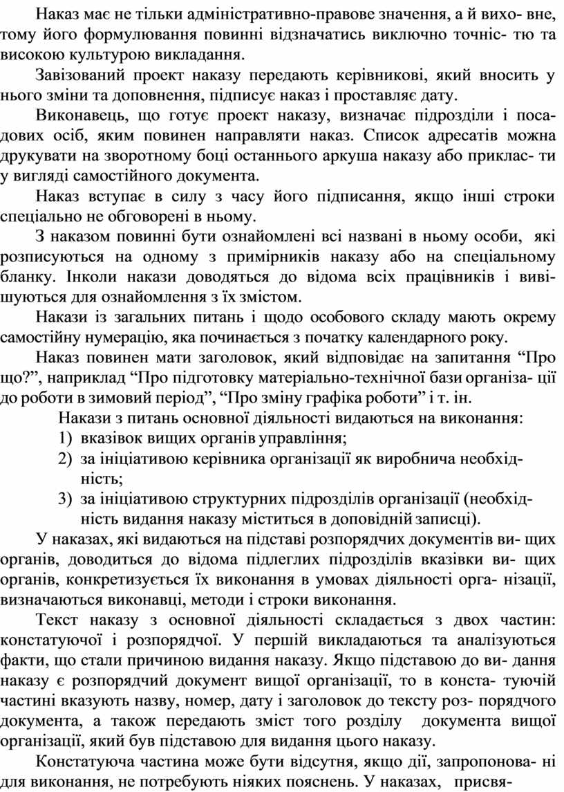 Текст наказу з основної діяльності складається з двох частин: констатуючої і розпорядчої. У першій викладаються та аналізуються факти, що стали причиною видання наказу. Якщо підставою до ви- дання наказу є розпорядчий документ вищої організації, то в конста- туючій частині вказують назву, номер, дату і заголовок до тексту роз- порядчого документа, а також передають зміст того розділу документа вищої організації, який був підставою для видання цього наказу.
