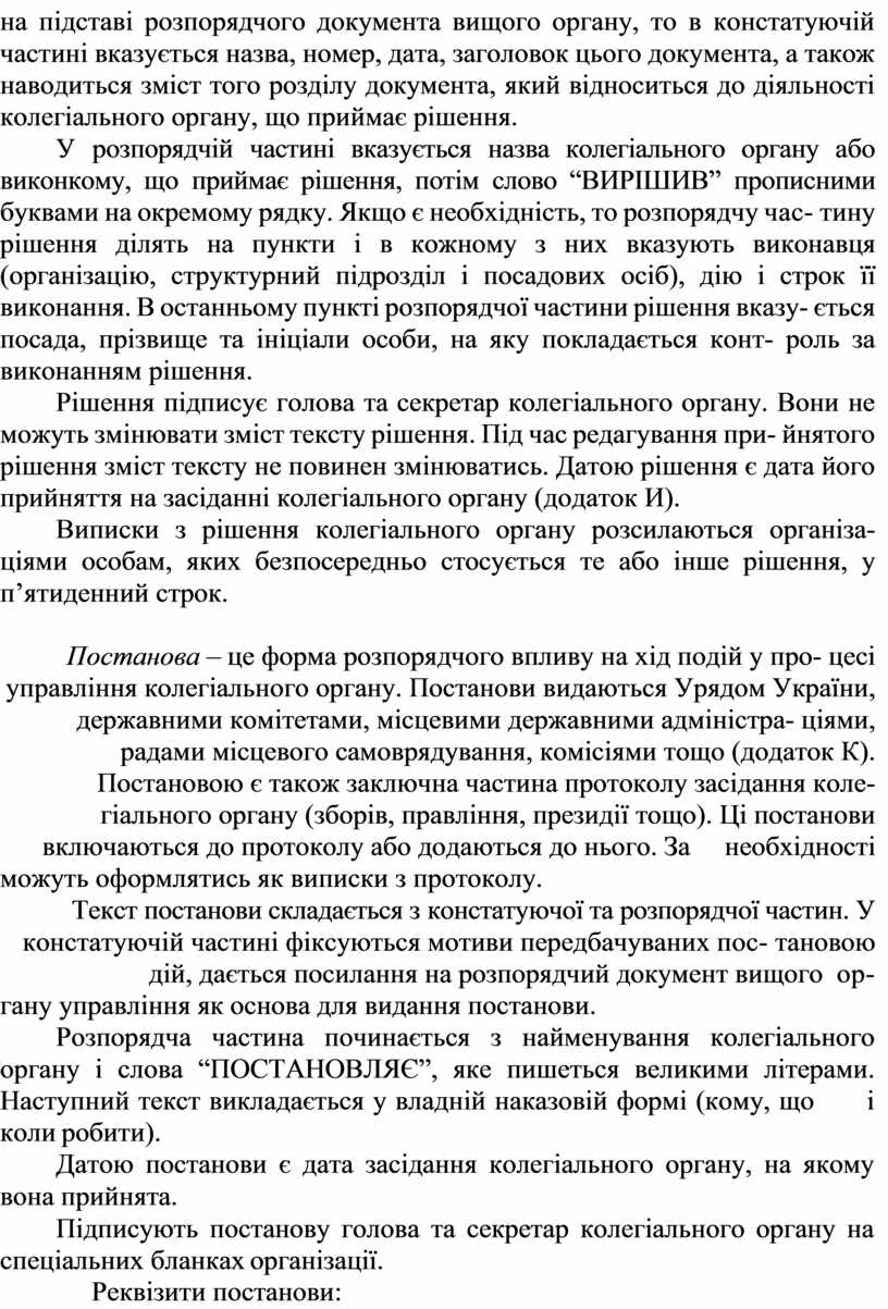Постанова – це форма розпорядчого впливу на хід подій у про- цесі управління колегіального органу. Постанови видаються Урядом України, державними комітетами, місцевими державними адміністра- ціями, радами місцевого самоврядування, комісіями тощо (додаток К). Постановою є також заключна частина протоколу засідання коле- гіального органу (зборів, правління, президії тощо). Ці постанови включаються до протоколу або додаються до нього. За необхідності
