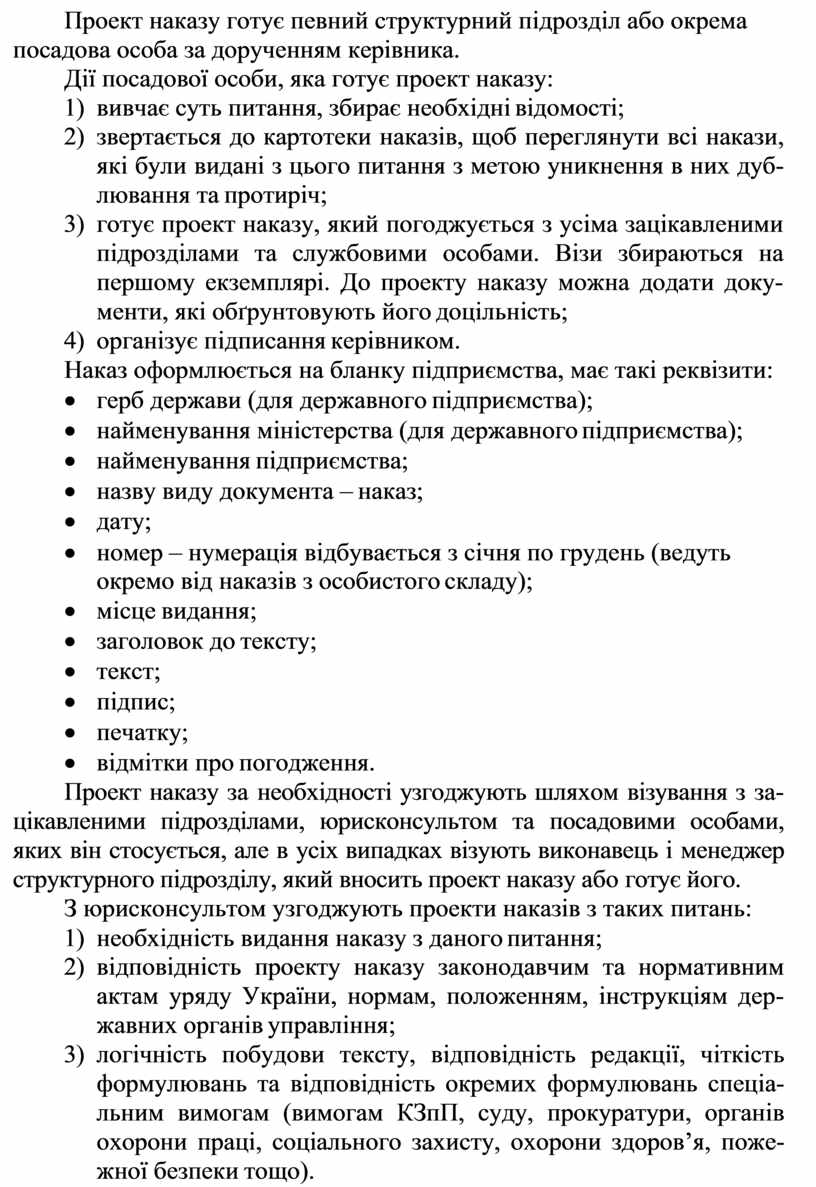 Проект наказу за необхідності узгоджують шляхом візування з за- цікавленими підрозділами, юрисконсультом та посадовими особами, яких він стосується, але в усіх випадках візують виконавець і менеджер структурного підрозділу, який вносить проект наказу або готує його.