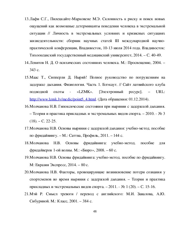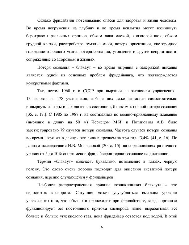 По данным исследования Н.В. Молчановой [20, с. 15], на соревнованиях различного уровня от 5 до 10% спортсменов-фридайверов теряют сознание на дистанции. Потеря сознания возникает вследствие острого кислородного голодания головного мозга во время выполнения статической задержки дыхания или ныряния в длину или в глубину, когда парциальное давление кислорода в легких падает ниже критического уровня [17, С. 25].