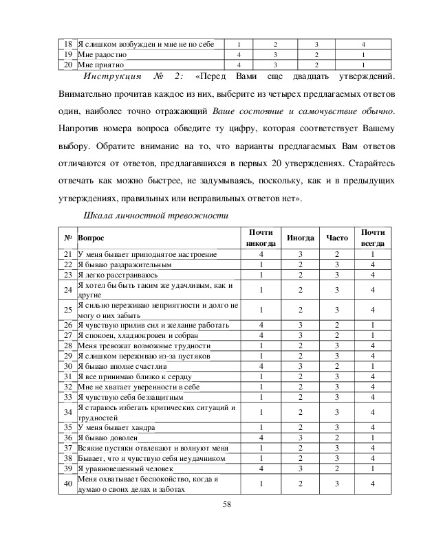 1) Определение показателей ситуативной и личностной тревожности с помощью