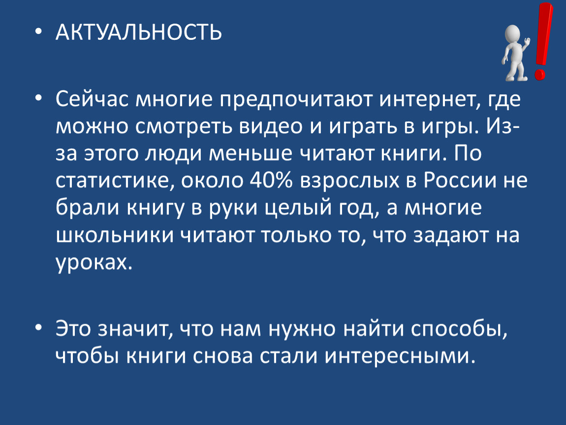 Сейчас многие предпочитают интернет, где можно смотреть видео и играть в игры. Из-за этого люди меньше читают книги. По статистике, около 40% взрослых в России не брали книгу в руки целый год, а многие школьники читают только то, что задают на уроках.