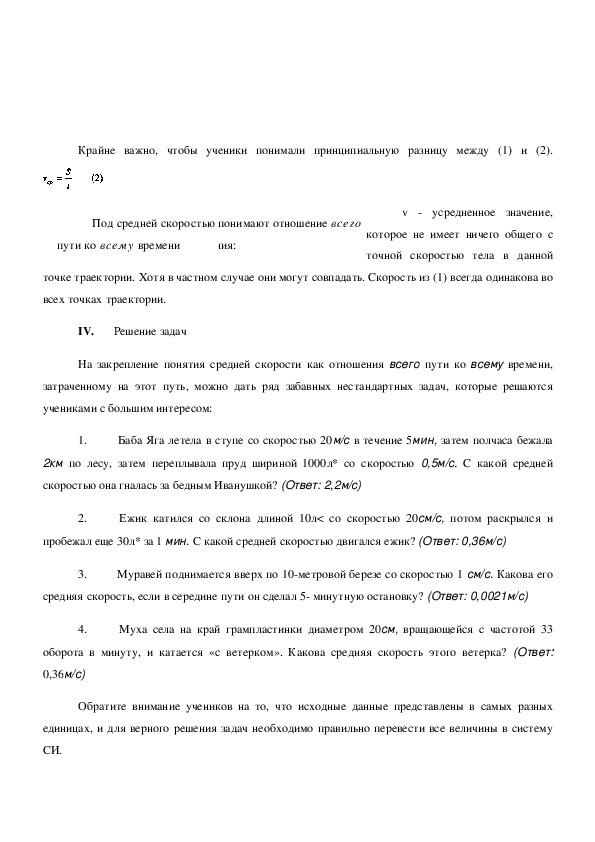 На закрепление понятия средней скорости как отношения всего пути ко всему времени,