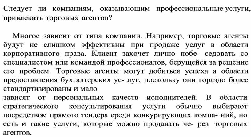 Многое зависит от типа компании. Например, торговые агенты будут не слишком эффективны при продаже услуг в области корпоративного права. Клиент захочет лично побе седовать со специалистом или командой профессионалов, берущейся за решение его проблем. Торговые агенты могут добиться успеха а области предоставления бухгалтерских ус луг, поскольку они гораздо более стандартизированы и мало