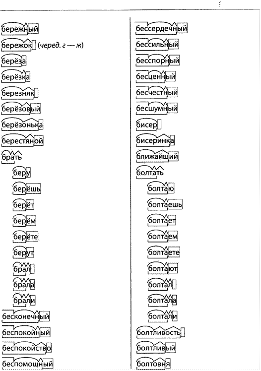 Слова расположены в алфавитном порядке. Кроме того, в словарике отмечены звуковые чередования в корнях слов.