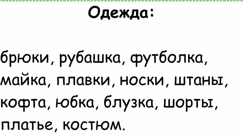 брюки, рубашка, футболка, майка, плавки, носки, штаны, кофта, юбка, блузка, шорты, платье, костюм.