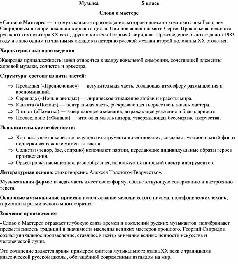 «Слово о Мастере» отражает глубокую связь времен и поколений русских музыкантов, подчёркивает преемственность традиций и значимость наследия великих мастеров прошлого. Георгий Свиридов создал уникальное произведение, ставящее в центр внимания вечные ценности искусства и человеческой души.