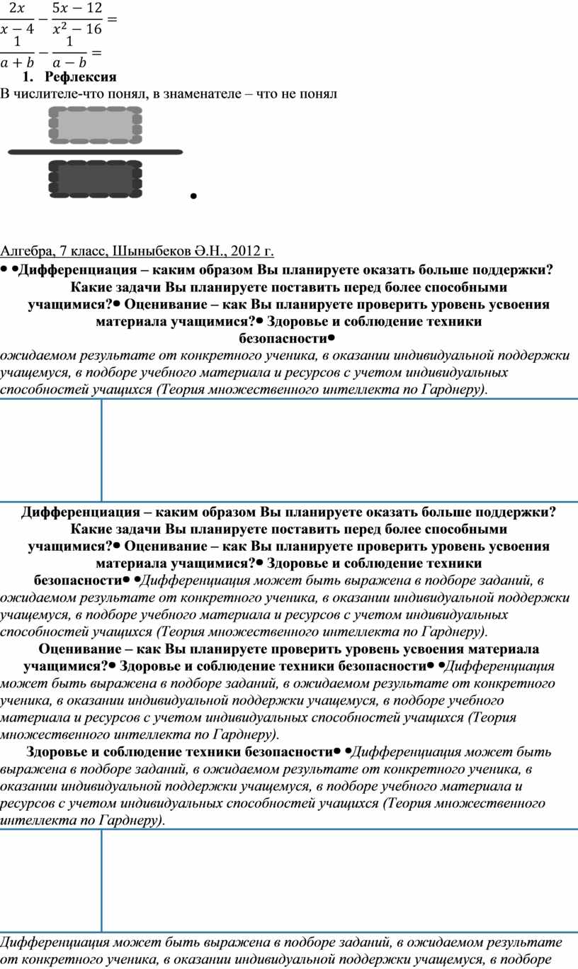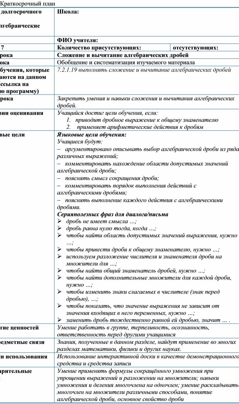 Языковые цели обучения: Учащиеся будут: - аргументировано описывать выбор алгебраической дроби из ряда различных выражений; - комментировать нахождение области допустимых значений алгебраической дроби; - пояснять смысл сокращения дроби; - комментировать порядок выполнения действий с алгебраическими дробями; - пояснять выполнение каждого действия с алгебраическими дробями. Серияполезных фраз для диалога/письма Ø дробь не имеет смысла …; Ø дробь равна нулю тогда, когда …; Ø чтобы найти область допустимых значений выражения, нужно …; Ø чтобы привести дроби к общему знаменателю, нужно …; Ø используем разложение числителя и знаменателя дроби на множители для …; Ø чтобы найти общий знаменатель дробей, нужно …; Ø чтобы найти дополнительные множители для каждой дроби, нужно …; Ø чтобы изменить знаки слагаемых в числителе (знак перед дробью), …; Ø чтобы показать, что значение выражения не зависит от значения входящих в него переменных, нужно …; Ø заменить дробь тождественно равной ей дробью, значит … . |