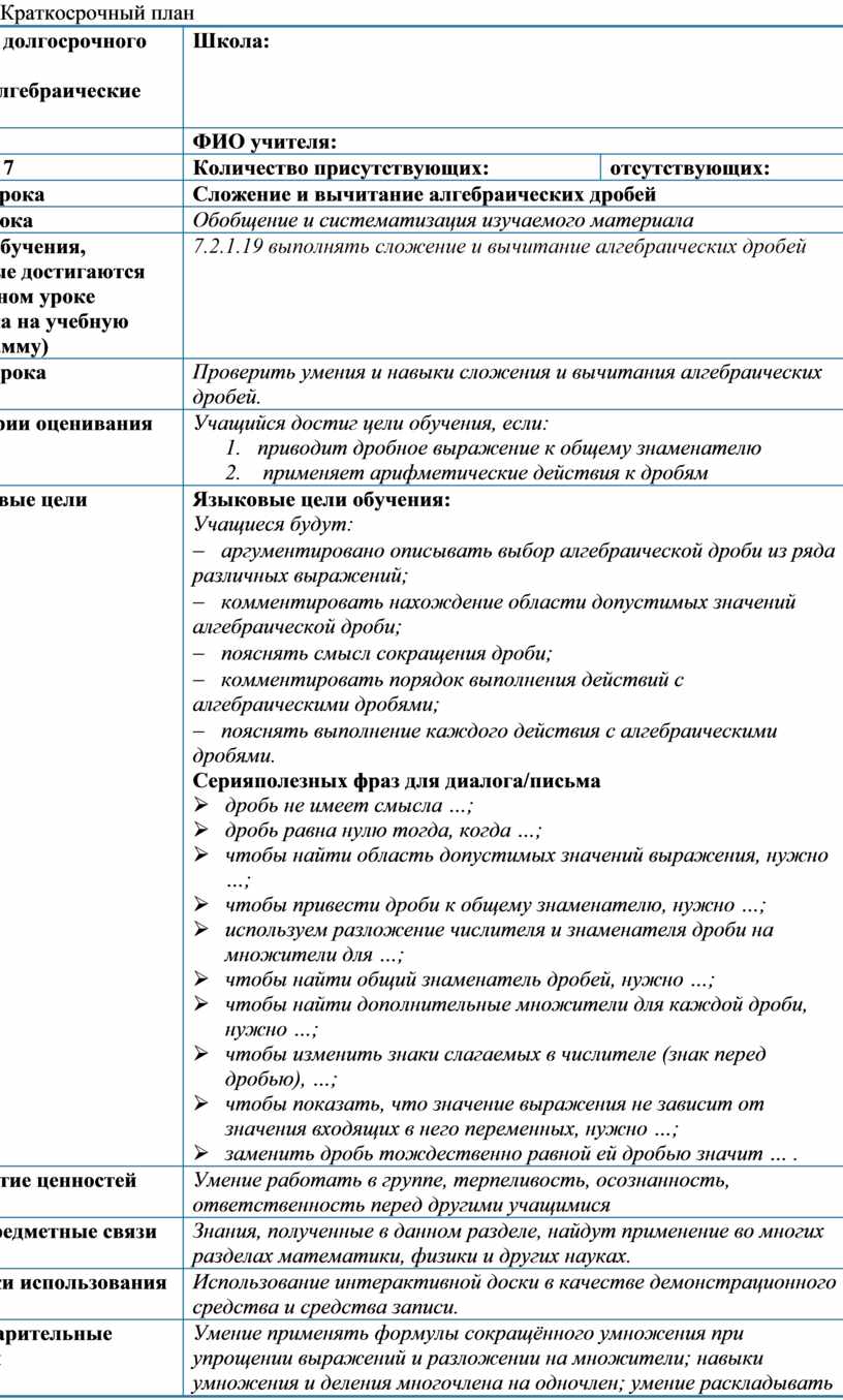7.2.1.19 выполнять сложение и вычитание алгебраических дробей
