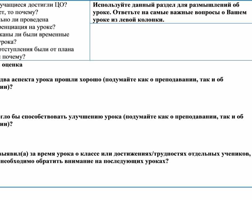 Используйте данный раздел для размышлений об уроке. Ответьте на самые важные вопросы о Вашем уроке из левой колонки. |
