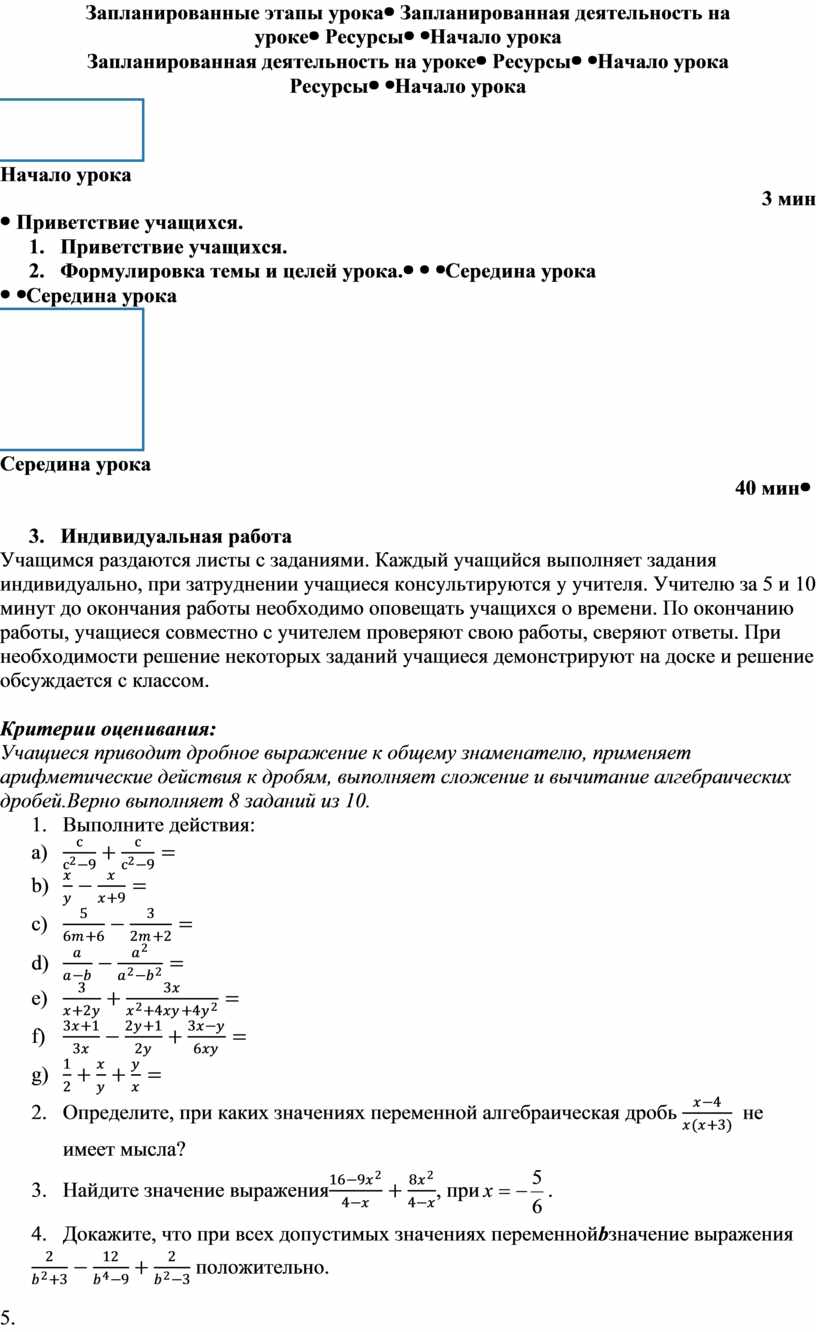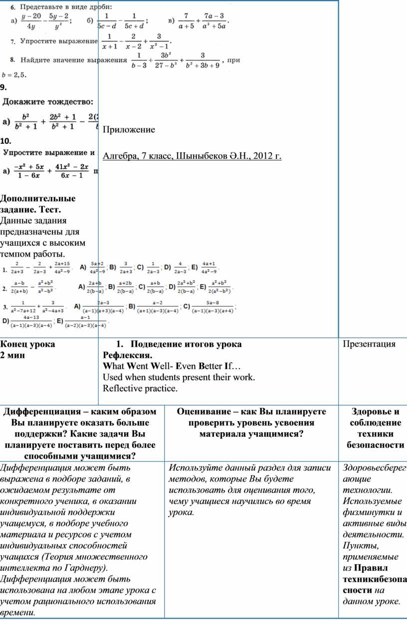 Критерии оценивания: Учащиеся приводит дробное выражение к общему знаменателю, применяет арифметические действия к дробям, выполняет сложение и вычитание алгебраических дробей.Верно выполняет 8 заданий из 10. 1. Выполните действия: a)