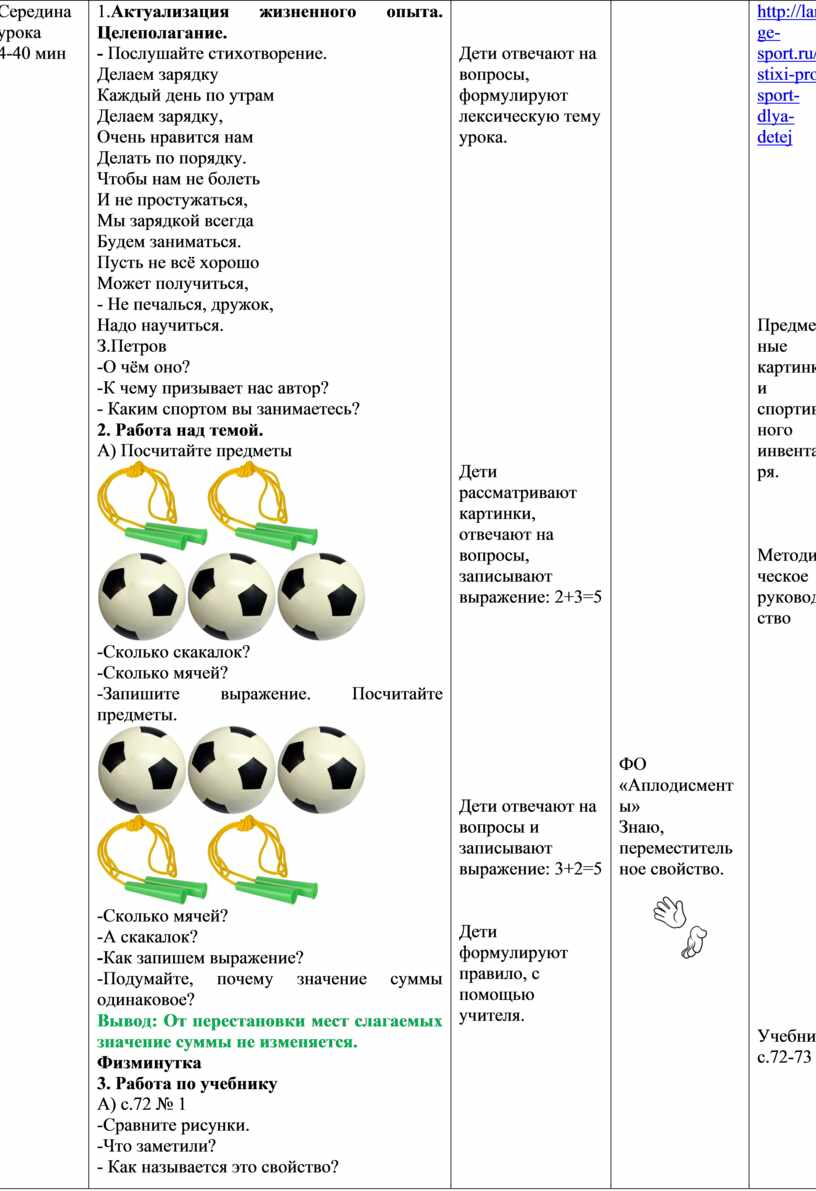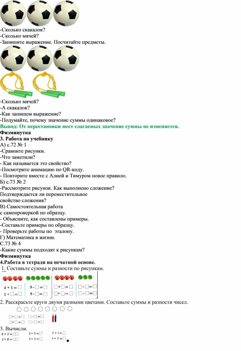 -Сколько мячей? -А скакалок? -Как запишем выражение? -Подумайте, почему значение суммы одинаковое? Вывод: От перестановки мест слагаемых значение суммы не изменяется. Физминутка 3. Работа по учебнику А) с.72 № 1 -Сравните рисунки. -Что заметили? - Как называется это свойство? -Посмотрите анимацию по QR-коду. - Повторите вместе с Алией и Тимуром новое правило. Б) с.73 № 2 -Рассмотрите рисунок. Как выполнено сложение? Подтверждается ли переместительное свойство сложения? В) Самостоятельная работа с самопроверкой по образцу. - Объясните, как составлены примеры. -Составьте примеры по образцу. - Проверьте работы по эталону. Г) Математика в жизни. С.73 № 4 -Какие суммы подходят к рисункам? Физминутка 4.Работа в тетради на печатной основе. 1. Составьте суммы и разности по рисункам.