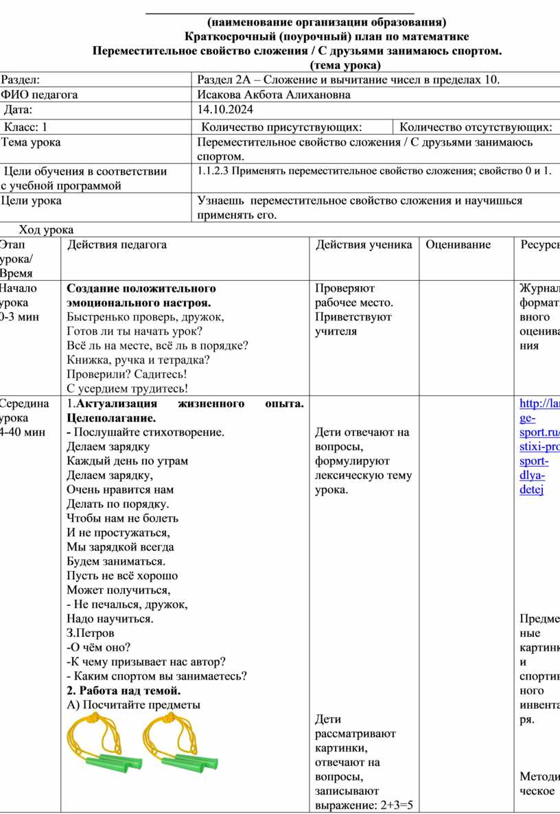 Краткосрочный (поурочный) план по математике