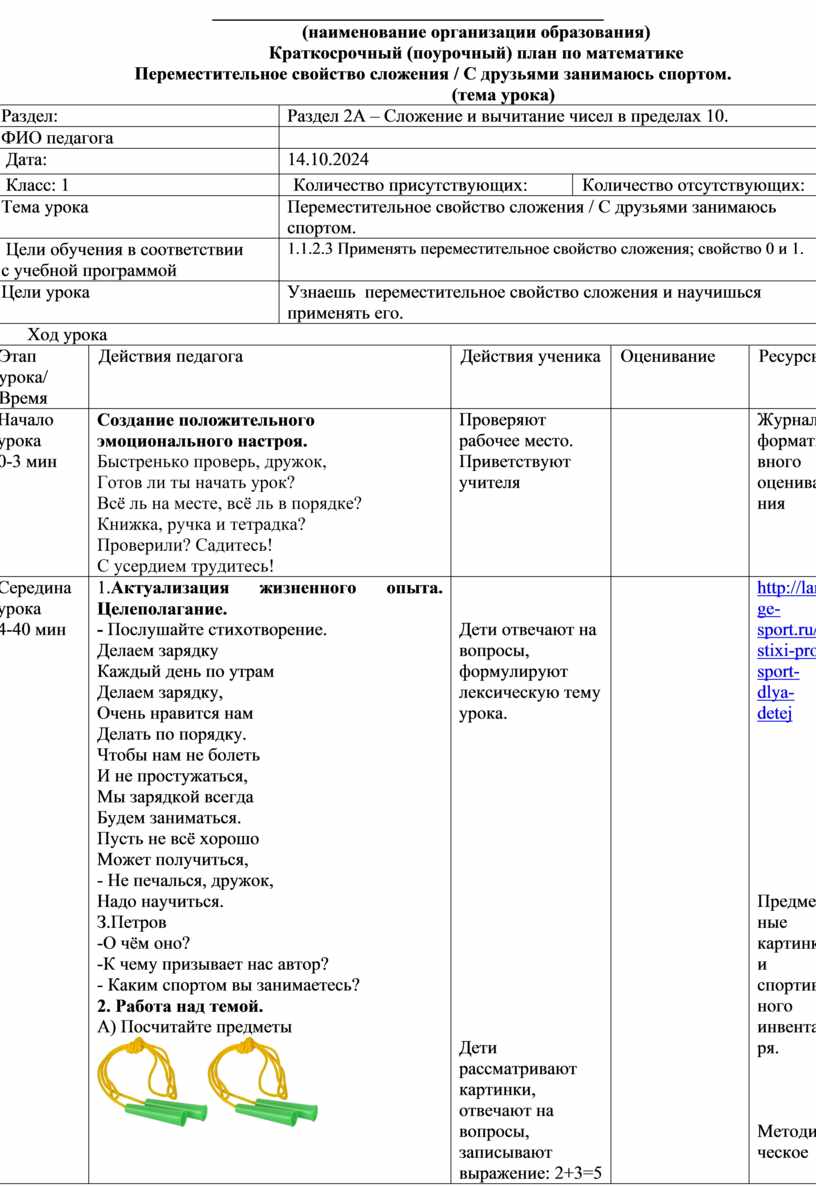 -Сколько мячей? -А скакалок? -Как запишем выражение? -Подумайте, почему значение суммы одинаковое? Вывод: От перестановки мест слагаемых значение суммы не изменяется. Физминутка 3. Работа по учебнику А) с.72 № 1 -Сравните рисунки. -Что заметили? - Как называется это свойство? -Посмотрите анимацию по QR-коду. - Повторите вместе с Алией и Тимуром новое правило. Б) с.73 № 2 -Рассмотрите рисунок. Как выполнено сложение? Подтверждается ли переместительное свойство сложения? В) Самостоятельная работа с самопроверкой по образцу. - Объясните, как составлены примеры. -Составьте примеры по образцу. - Проверьте работы по эталону. Г) Математика в жизни. С.73 № 4 -Какие суммы подходят к рисункам? Физминутка 4.Работа в тетради на печатной основе. 1. Составьте суммы и разности по рисункам.