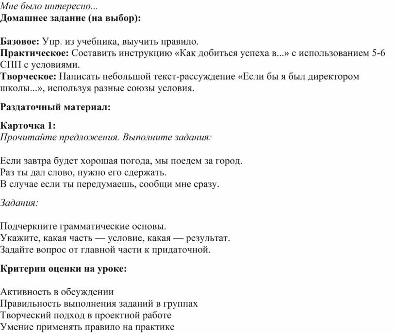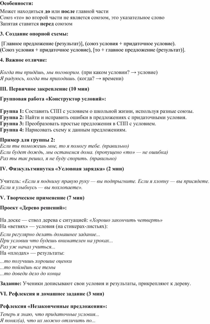 3. Творческое: Написать небольшой текст-рассуждение «Если бы я был директором школы...», используя разные союзы условия.