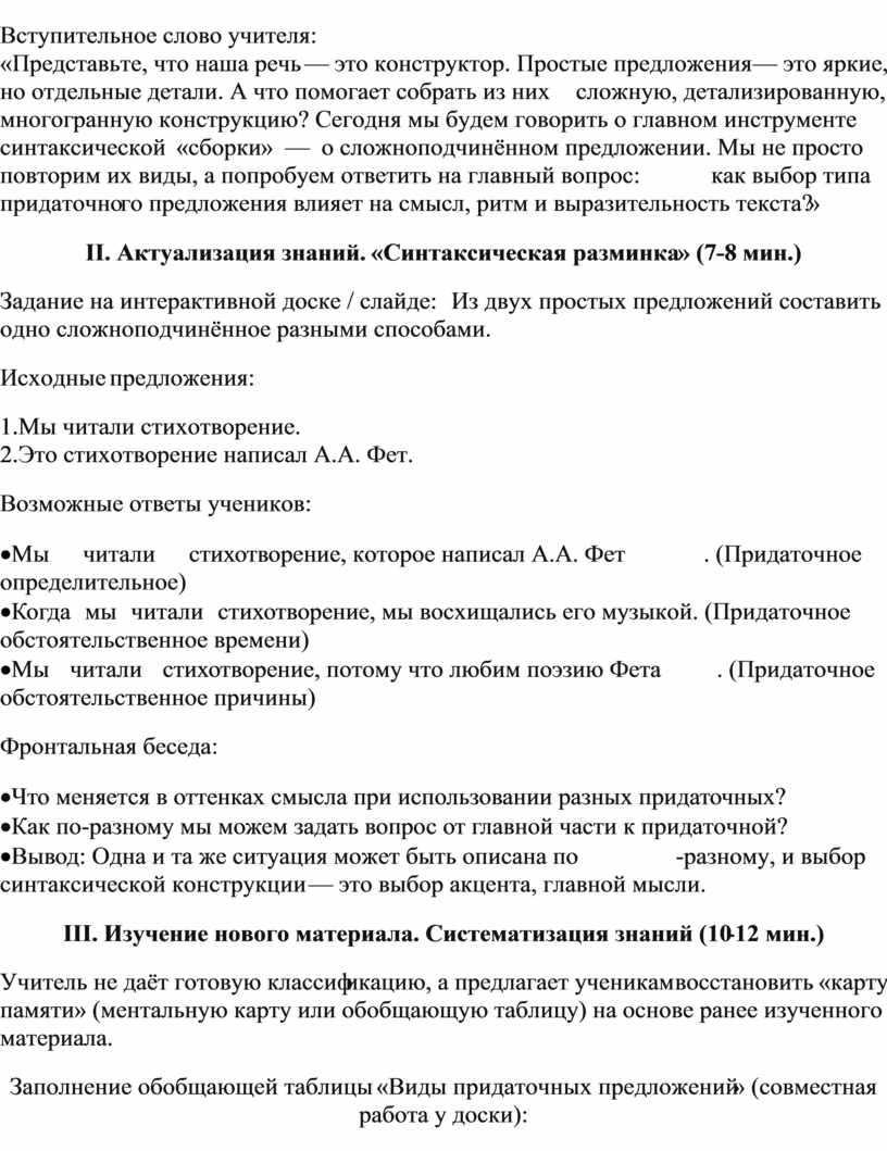 ·Заключительное слово учителя: «Мы убедились, что сложноподчинённые предложения — это каркас нашей речи, который позволяет ей быть не просто правильной, но и точной, образной, логичной и эмоциональной. Умение видеть и использовать этот каркас — признак зрелой, развитой речи».