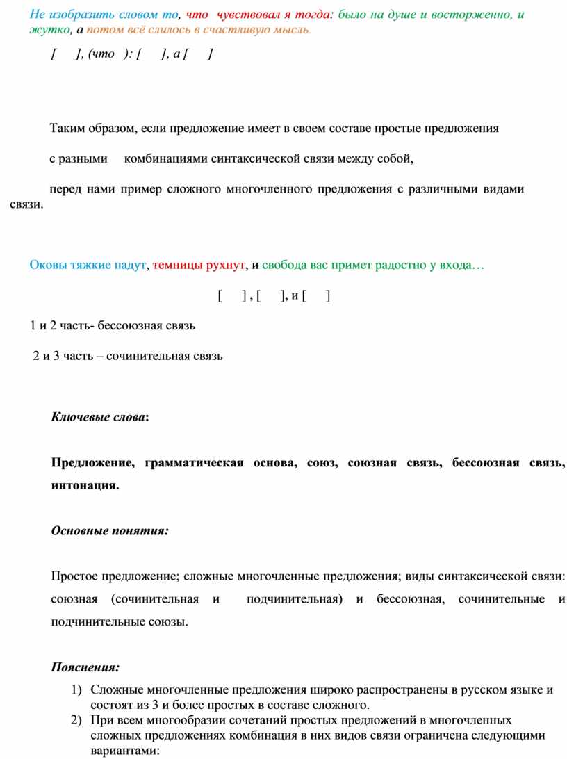 Простое предложение; сложные многочленные предложения; виды синтаксической связи: союзная (сочинительная и подчинительная) и бессоюзная, сочинительные и подчинительные союзы.