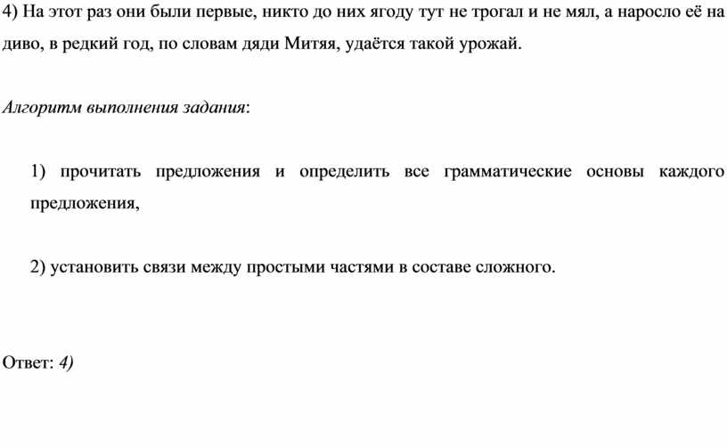 4) На этот раз они были первые, никто до них ягоду тут не трогал и не мял, а наросло её на диво, в редкий год, по словам дяди Митяя, удаётся такой урожай.